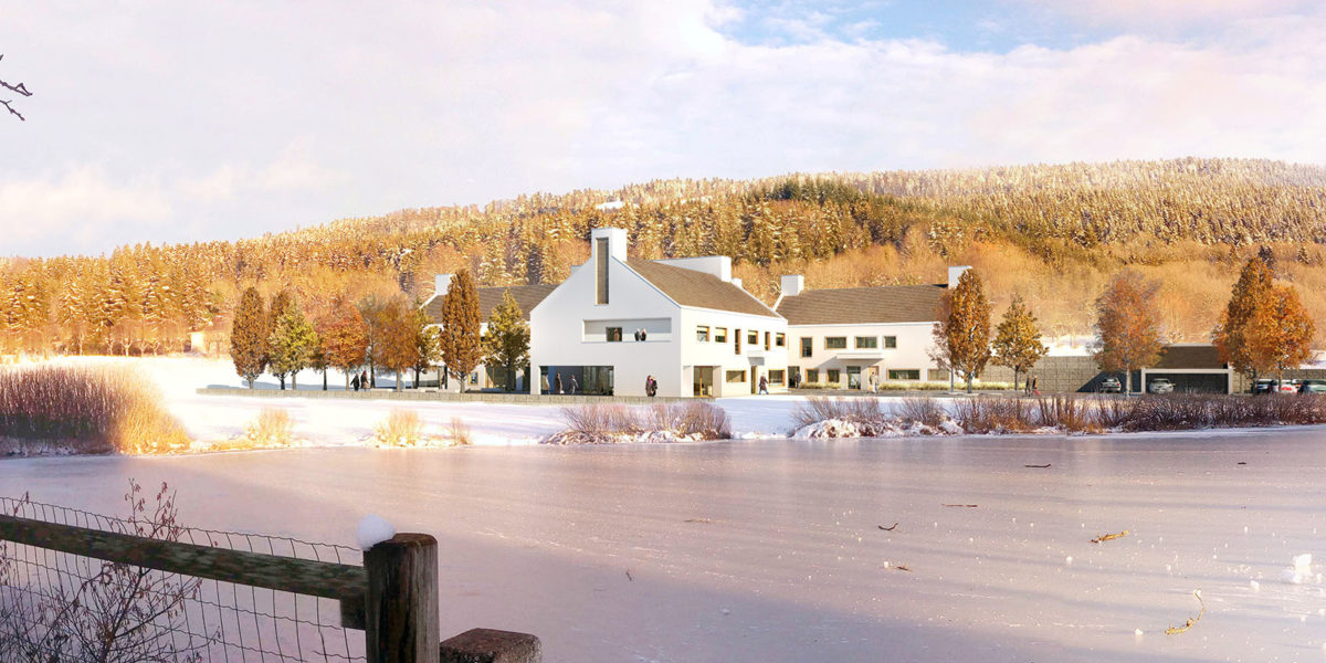 L’objet du concours est de reconstruire le centre d’addictologie occupant une maison ancienne inadaptée aux normes et aux besoins actuels. Le site proposé à proximité s’inscrit dans un paysage exceptionnel de moyenne montagne au centre d’une vaste prairie au bord d’un étang entouré de forêts. Nous avons souhaité insérer le bâtiment dans un projet de paysage valorisant la nature comme source de bien-être thérapeutique pour les résidents.