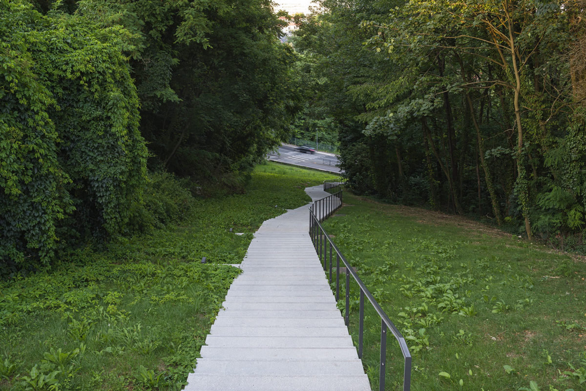 Afin de privilégier l’intégration paysagère dans cet espace public à dominante végétale, nous avons conçu un emmarchement dont les marches et les paliers dissimulés dans l’herbe sinuent entre les arbres et épousent le terrain naturel. L’éclairage public est intégré dans la main courante et dans les lanternes au sol afin d’éviter l’effet d’éblouissement et de pollution lumineuse.