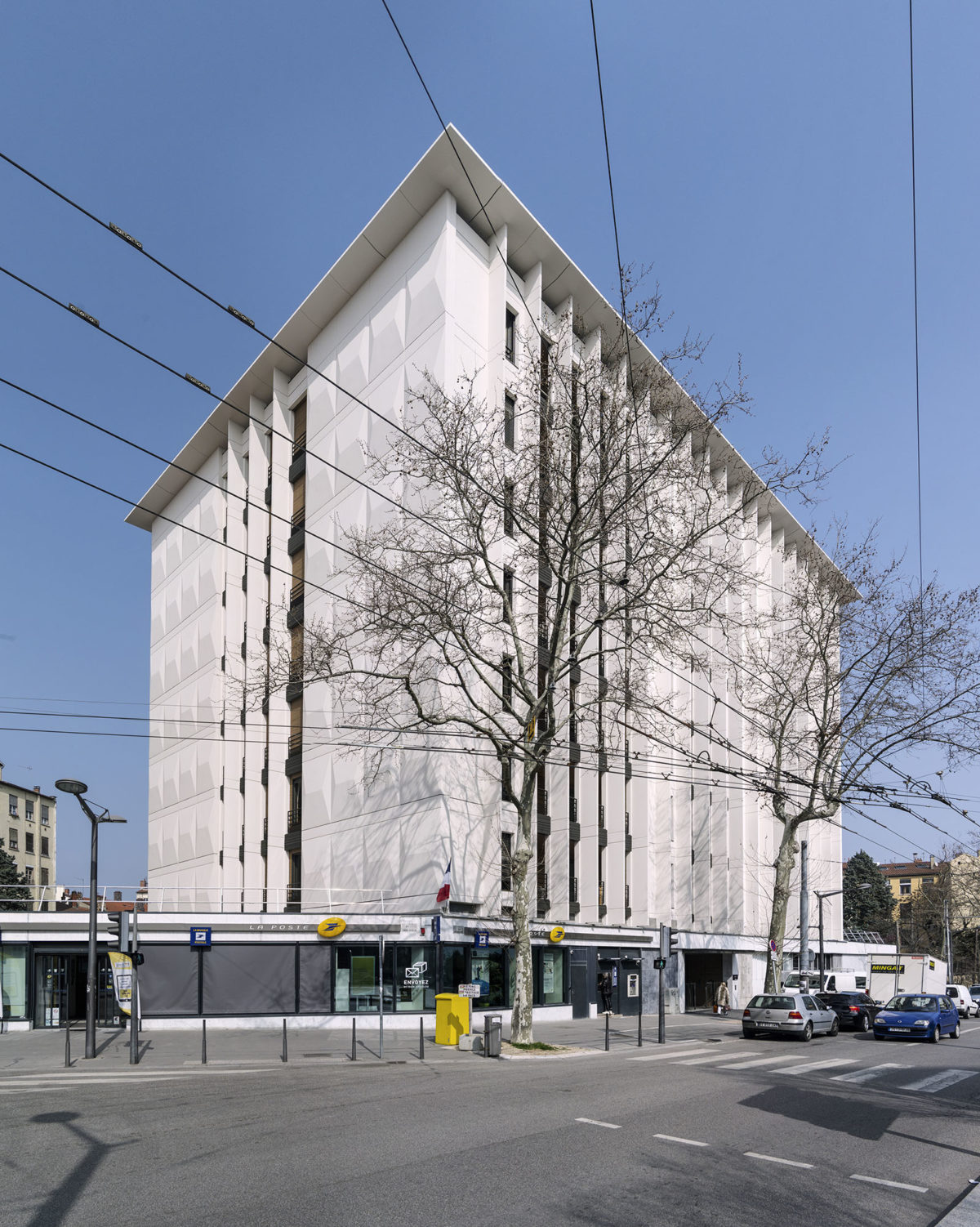 L’immeuble de bureaux de la Poste abritait une agence, un centre de tri ainsi qu’un important centre de formation répartis sur sept étages. Il était typique de l’architecture des immeubles de bureaux des années 1970 en béton préfabriqué. Afin d’être réhabilité en immeuble de logements, l’atelier a imaginé ouvrir les façades avec des loggias à ossature bois.