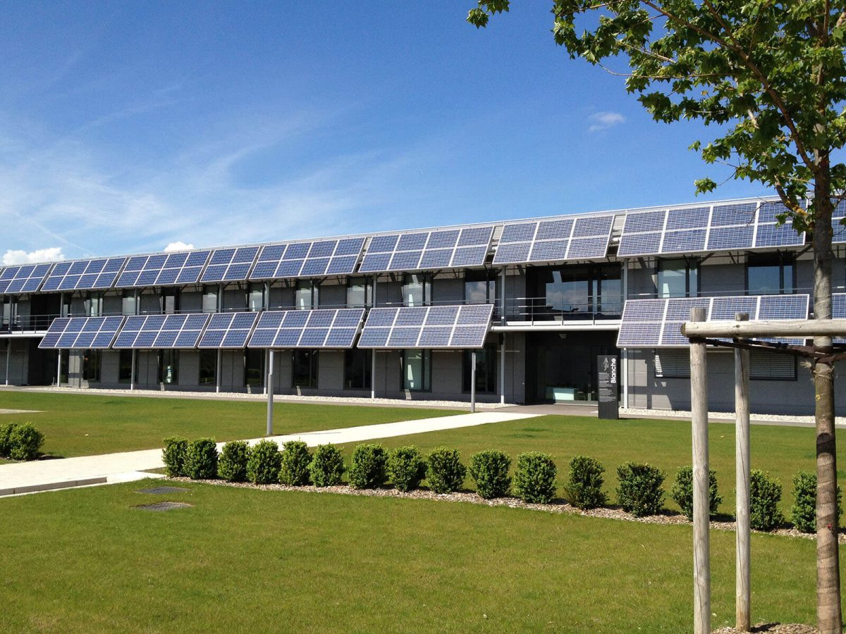 La façade sud est composée d’une enveloppe double peau. Elle est réalisée en châssis vitrés et en cassettes aluminium avec une isolation performante par l’extérieur. Deux passerelles s’adossent à la façade et supportent des brise-soleils constitués de panneaux photovoltaïques.