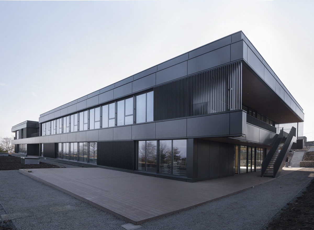 Afin d’insérer ce programme tertiaire dans le quartier résidentiel l’atelier a conçu un bâtiment bas et horizontal au plus près du nivellement du terrain.